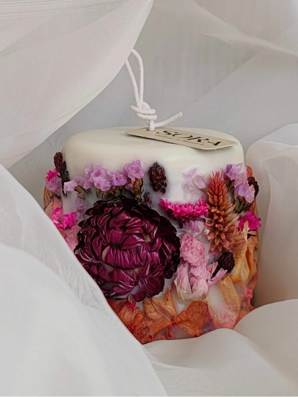 Conto de Fadas é decorada com flores desidratadas em tons de lilás, rosa e roxo. Sempre traz a flor libélula —pequena e etérea, como uma fada. Os demais elementos variam a cada criação, tornando cada vela única, como um fragmento de um conto encantado.