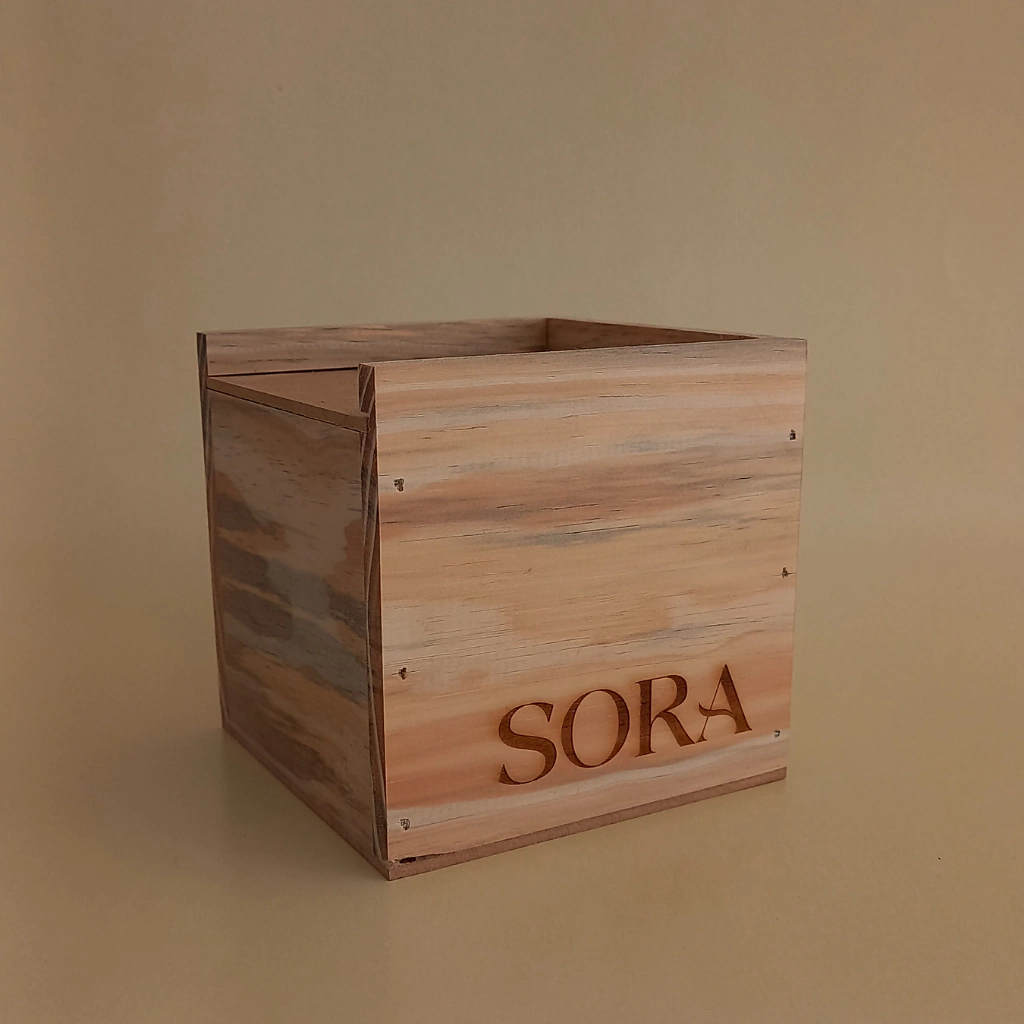Acompanha base de madeira rústica e caixa de madeira sob medida (embalagem conta com laço de fita gorgurão e mini buquê desidratado).