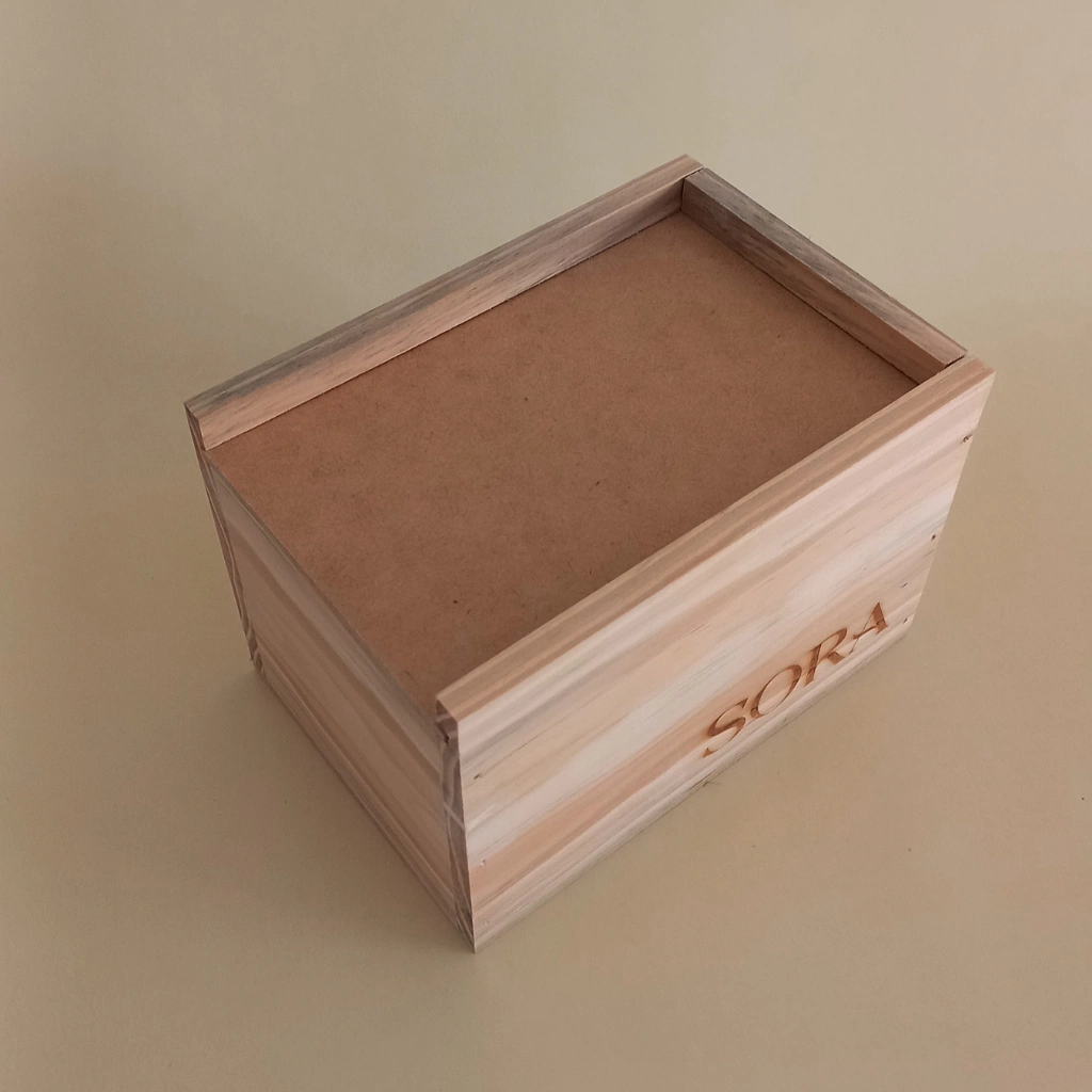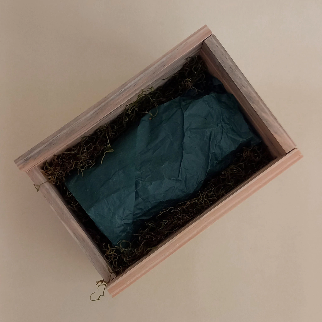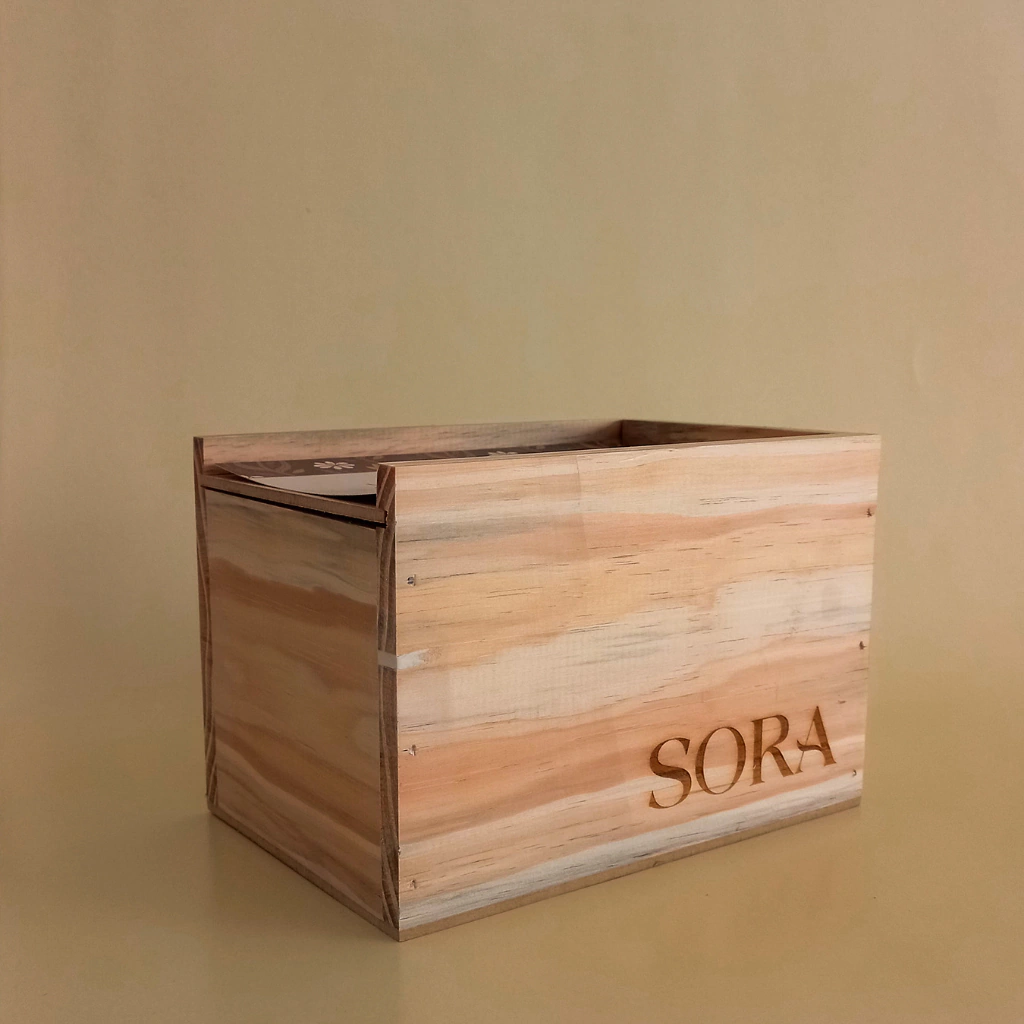 Acompanha base de madeira rústica e caixa de madeira sob medida (embalagem conta com laço de fita e mini buquê desidratado).