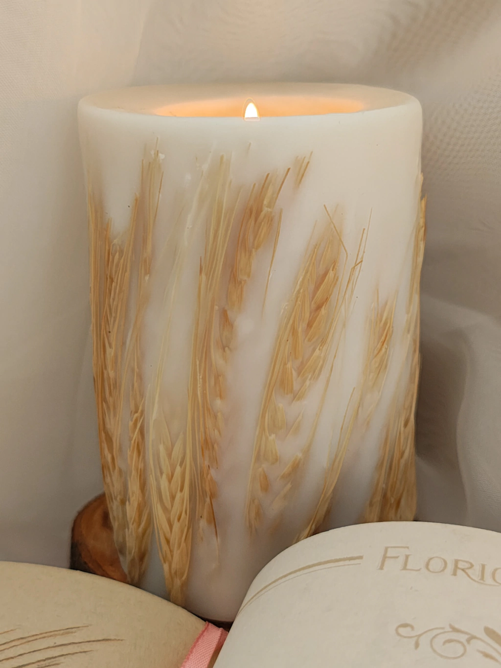 Golden Harvest é adornada com trigo desidratado, com a disposição dos elementos sempre variando de uma vela para outra. O trigo simboliza prosperidade, abundância e renascimento, sendo um emblema da colheita farta, da conexão com a terra e da gratidão pelo ciclo da vida.