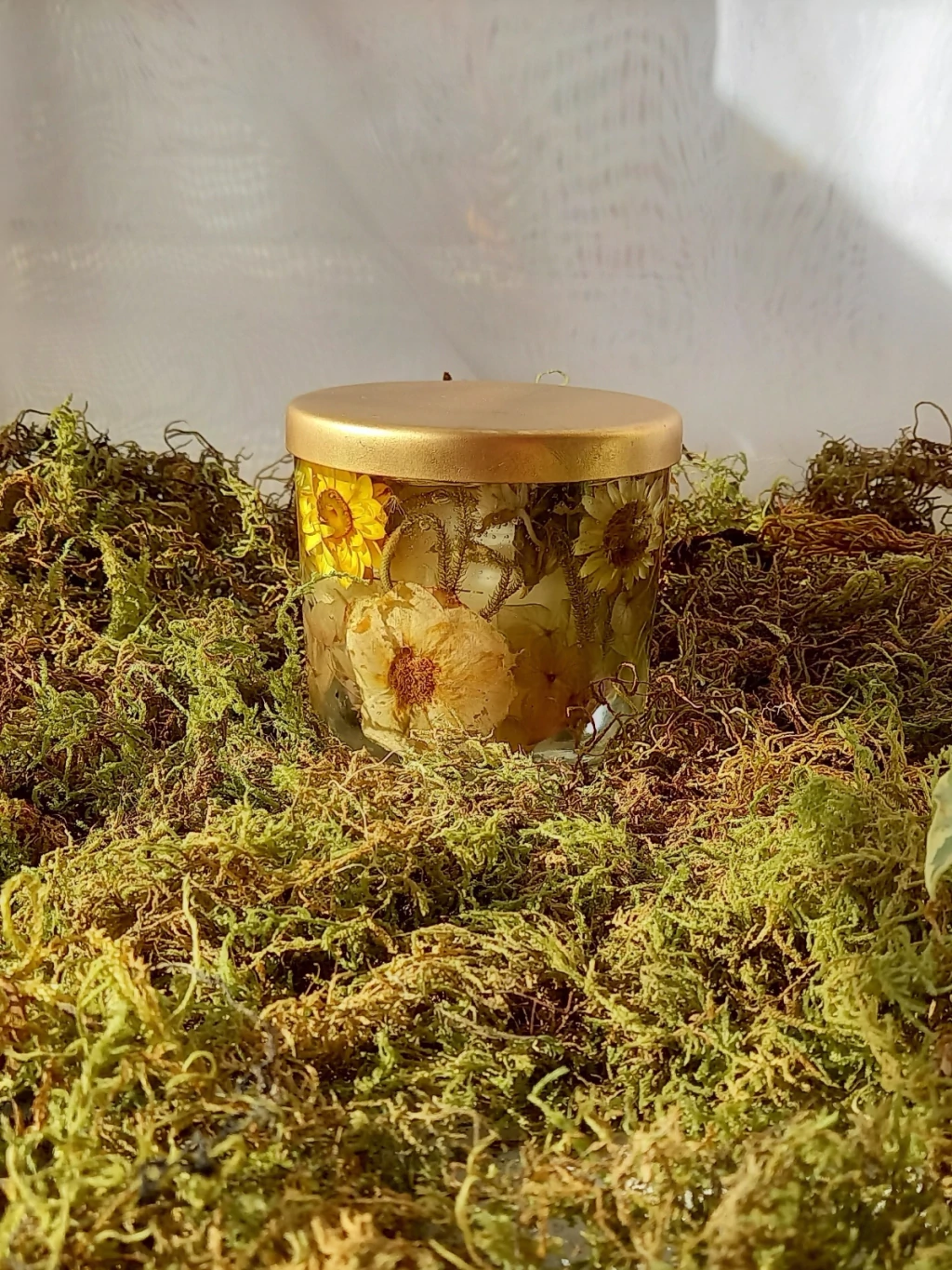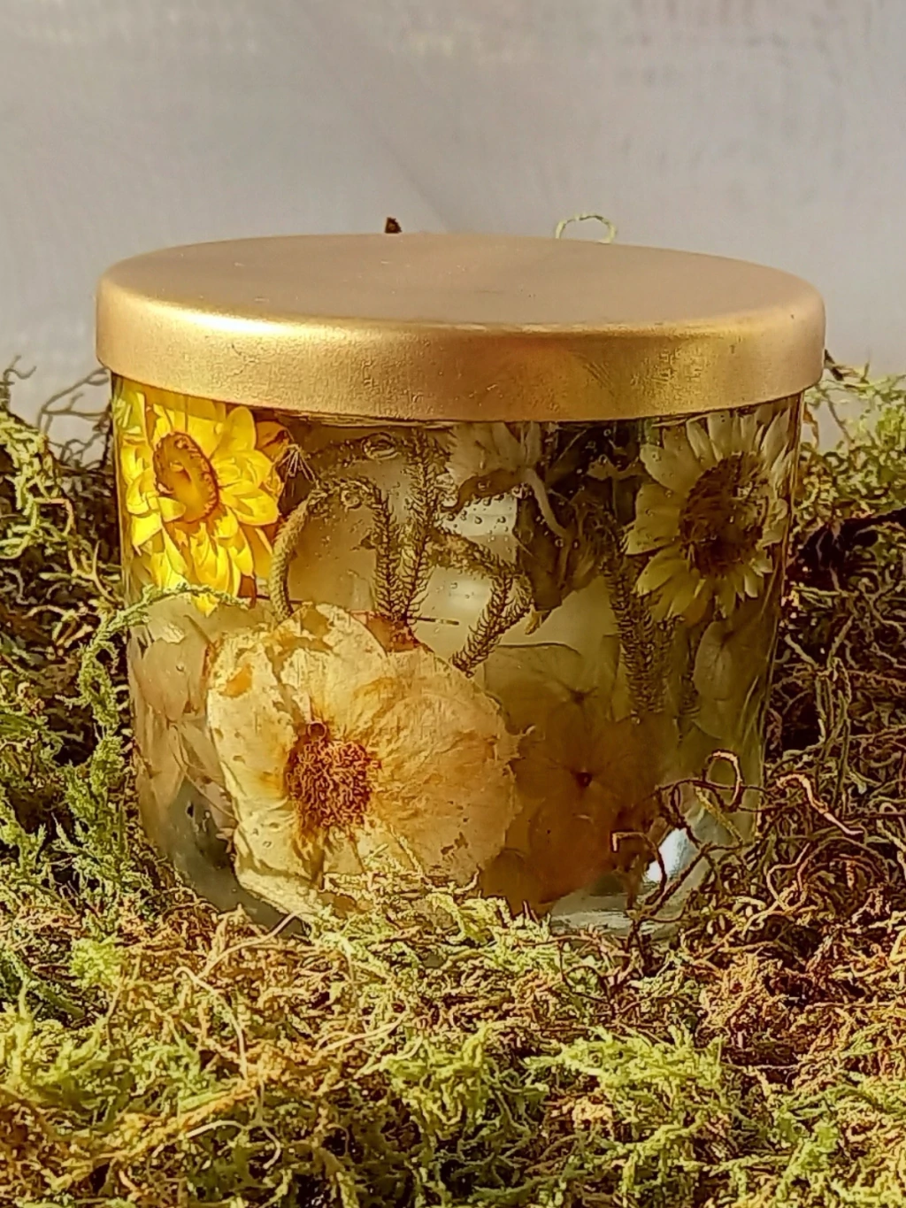Composição da luminária: Parafina Gel e flores desidratadas.