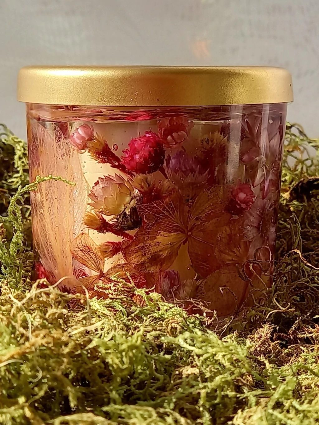 Composição da luminária: Parafina Gel e flores desidratadas.