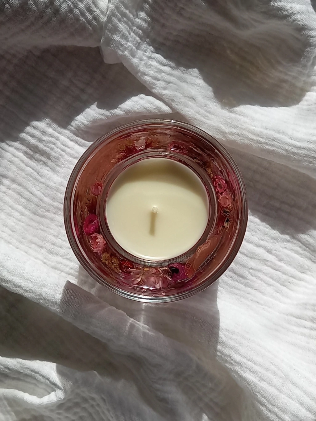 A vela de Magnólia e Peônia é composta de flores desidratadas em tons de rosa. Nenhuma vela será igual a outra.